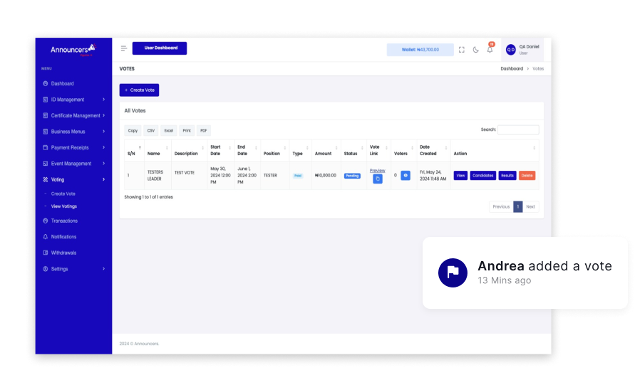 We provide a platform to set up Election and for voters to cast their votes. When the Election Starts, each of the voters will receive an email with a secret, single use voting link, the voters clicked on the link to be immediately taken to the voting page to cast vote for the aspirant. Voters can only vote once and voting choices remain anonymous, each ballot has one, secure voting key and the voting is auditable, verifiable and can be independently observed.